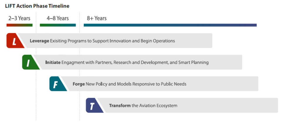 The AAM Comprehensive Plan designates a responsible agency and codifies the necessary actions to accomplish the goals of the strategy for each of the distinct pillars. The plan provides an integrated master schedule for these actions. Using the acronym LIFT–Leverage, Initiate, Forge, Transform–the plan separates actions into four phases with distinct themes. This plan acknowledges both the necessity of overlap in timing for actions as well as possible delays as the uncertainty of the future unfolds. However, the timeline looks realistic with implementation at scale outside of eight years from the adoption of the plan.